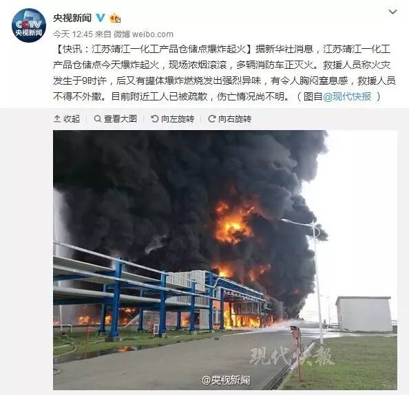 4月22日(昨天)上午9点40分左右,位于江苏泰州靖江市新港园区的江苏德桥仓储有限公司发生,现场火焰高达二三十米,浓烟如蘑菇云。德桥仓储公司主要从事液态散化及油品的仓储中转、分拨、灌装业务,厂区有燃油罐、柴油罐、汽油罐12座,化工储罐30座。发生后,泰州、南京、苏州、常州、镇江、扬州、无锡、上海、徐州等地消防先后投入上百辆消防车,千名消防官兵前往支援。